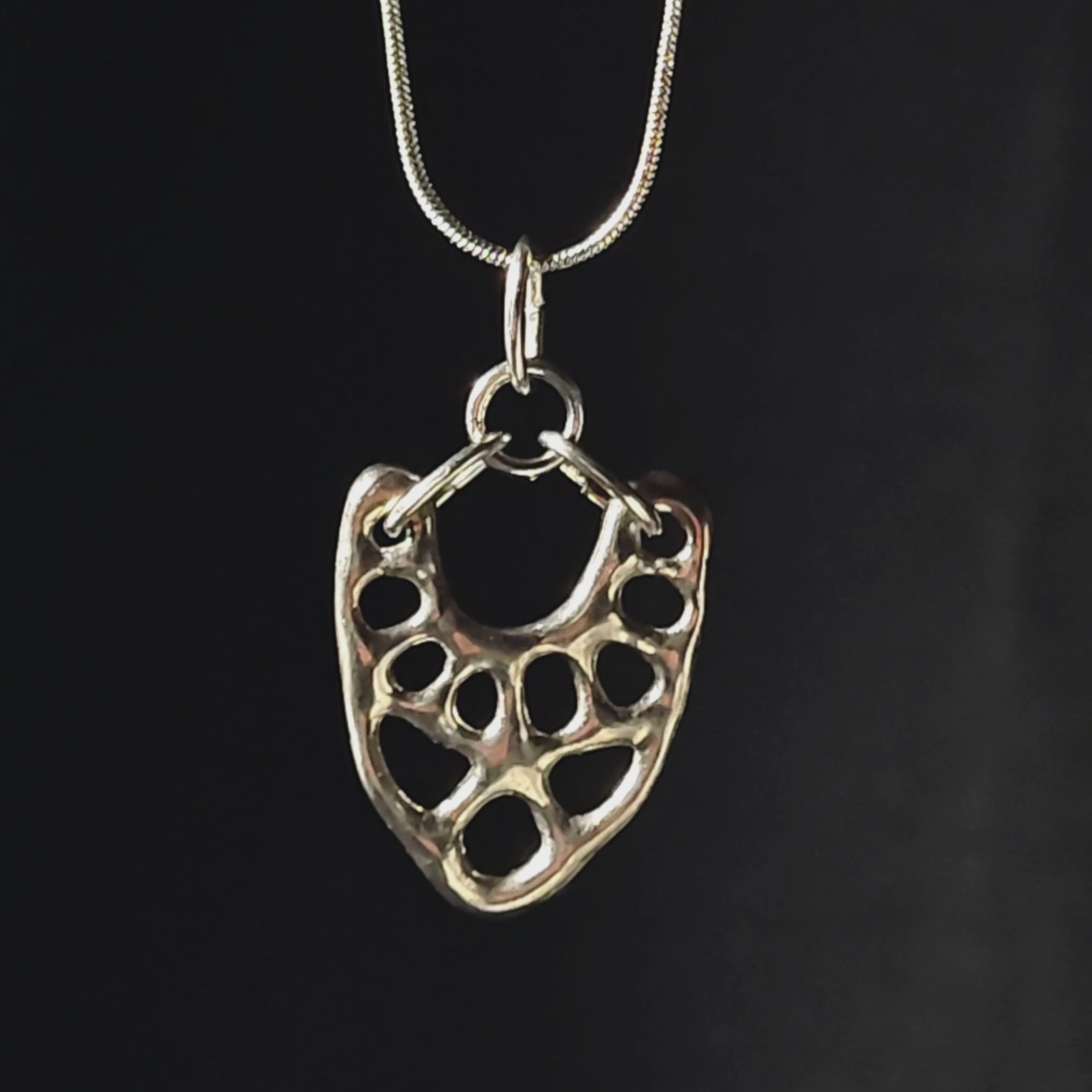 Porcelain lace pendant glazed with liquid platinum lustre.